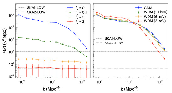 图:模拟得到的21厘米森林一维功率谱。通过一维功率谱测量,可以显著提高探测的灵敏度。通过一维功率谱的幅度和形状,将可以同时对温暗物质和宇宙加热效应进行测量。