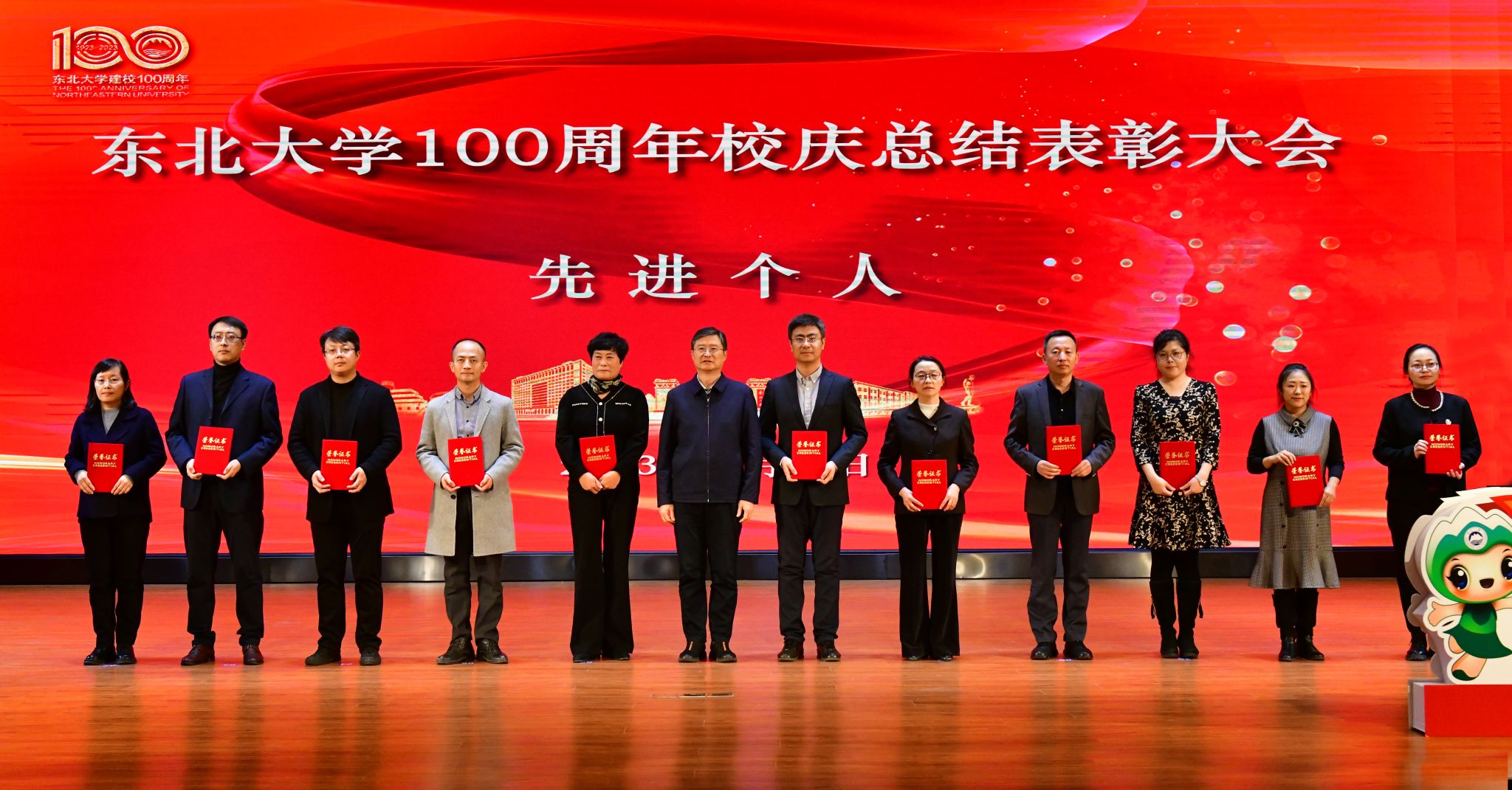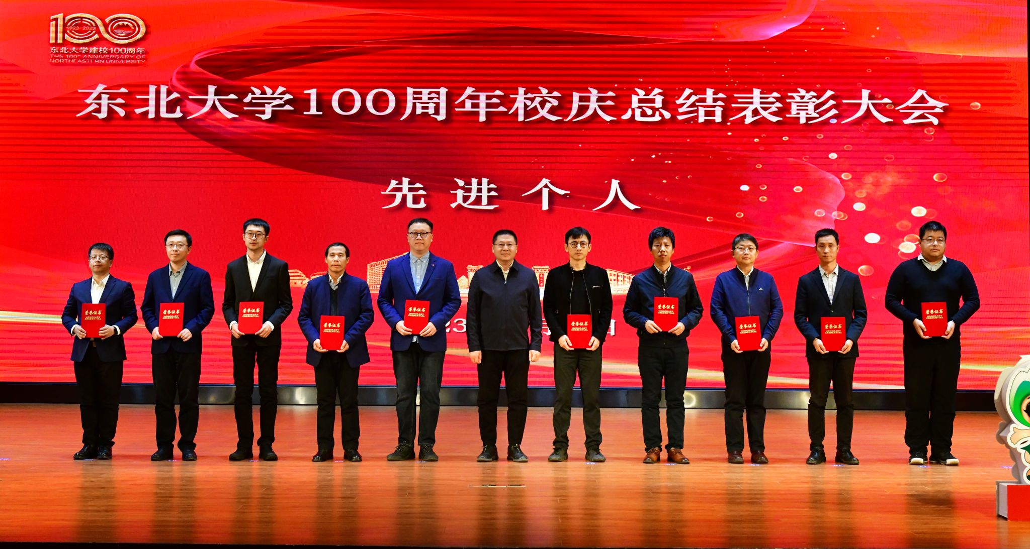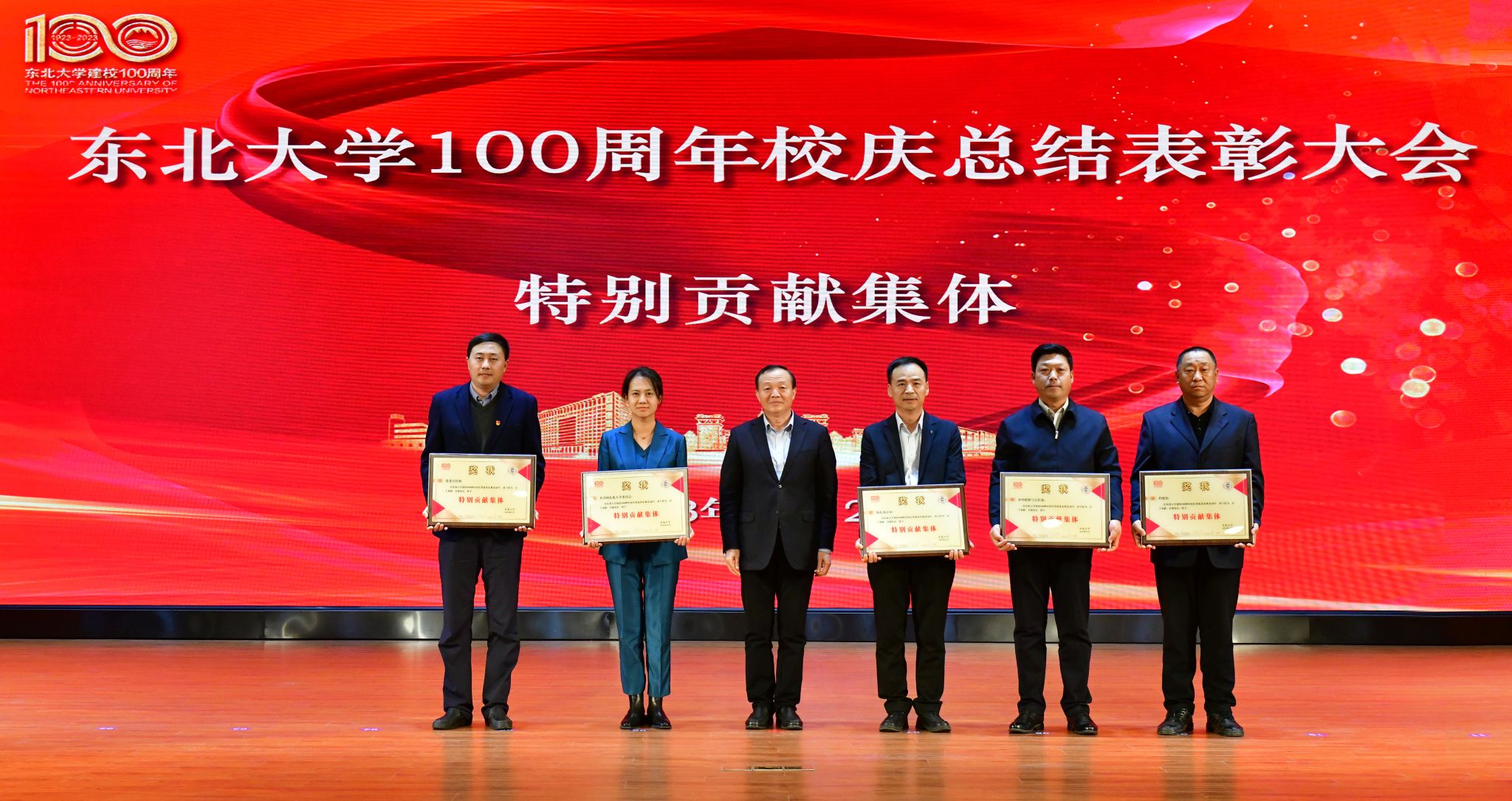 校党委副书记王玉琦宣读《关于表彰东北大学百年校庆工作先进集体和先进个人的决定》,党委宣传部等5个集体获得“特别贡献集体”奖,文法学院等22个部门获得“百年校庆工作先进集体”奖,于天彪等298名个人获得“百年校庆工作先进个人”奖,叶体民等332人获得“百年校庆工作优秀学生志愿者”奖和“百年校庆工作优秀学生演员”奖。校领导为获奖集体和个人代表颁发了奖牌和荣誉证书。